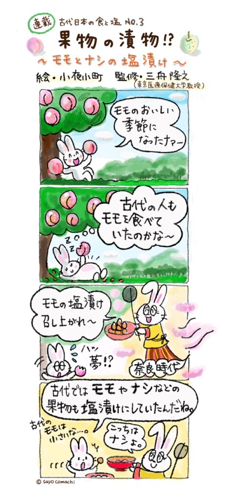 古代(本連載では、文献史料が残っている奈良時代・平安時代が対象です)の日本ではどんなものが食べられ、またどのように塩が使われていたのでしょうか? 『古代日本の食を再現する』等の著書がおありの三舟隆之先生(東京医療保健大学教授)のご監修のもと、イラストレーターの小夜小町(さよ・こまち)さんに、4コマ漫画で再現していただきます。